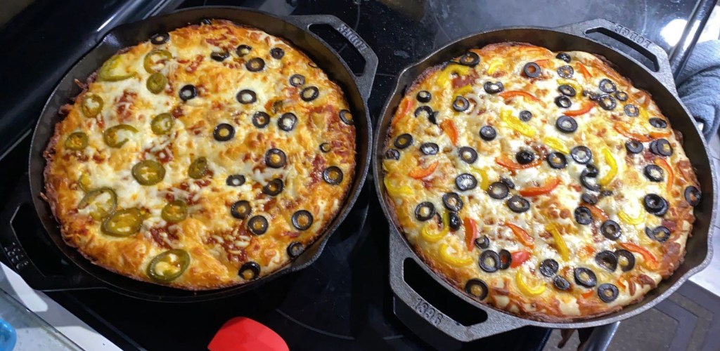 This thick pizza with a crispy crust is filled with warm stringy cheese and can be topped off with your choice of toppings. All you really need is your dough, cheese, toppings, sauce, and a huge greased-up cast iron pan. This pizza will have you grabbing for seconds, thirds, and fourths.